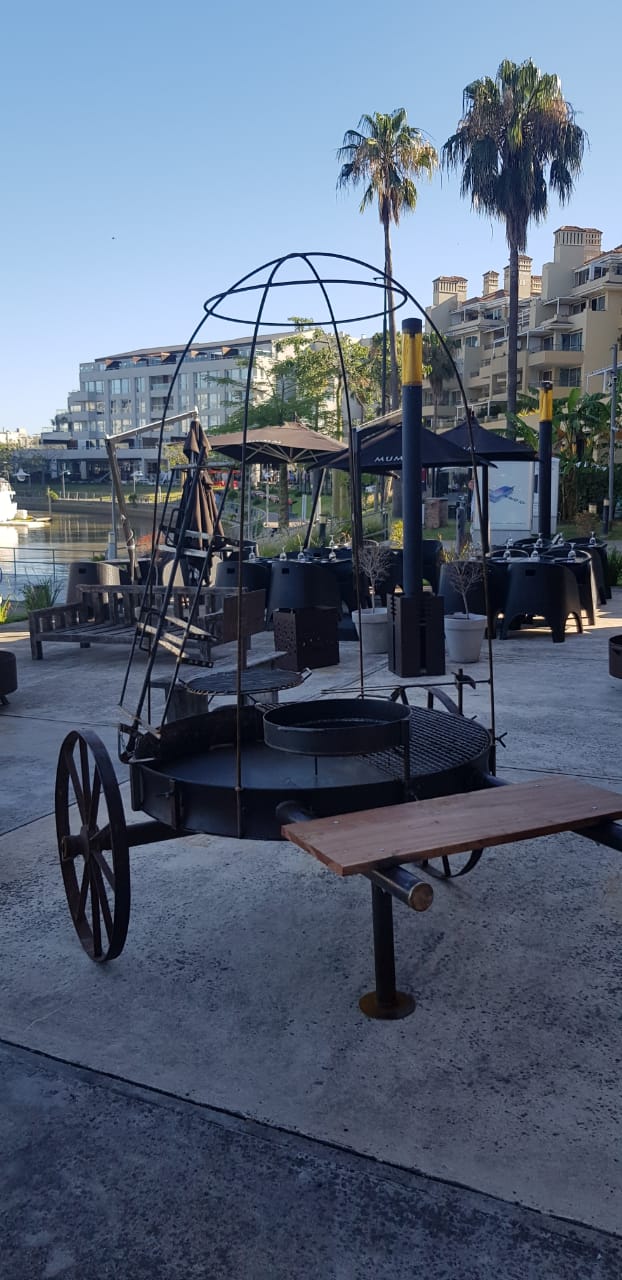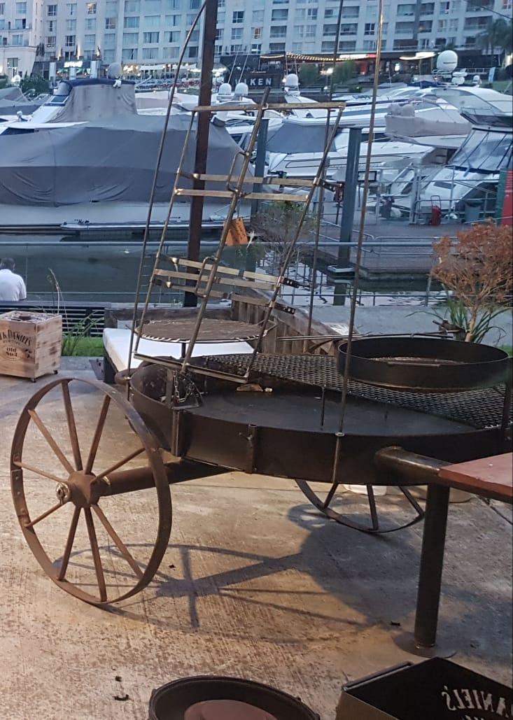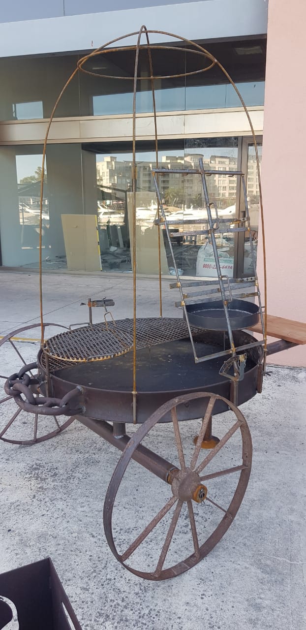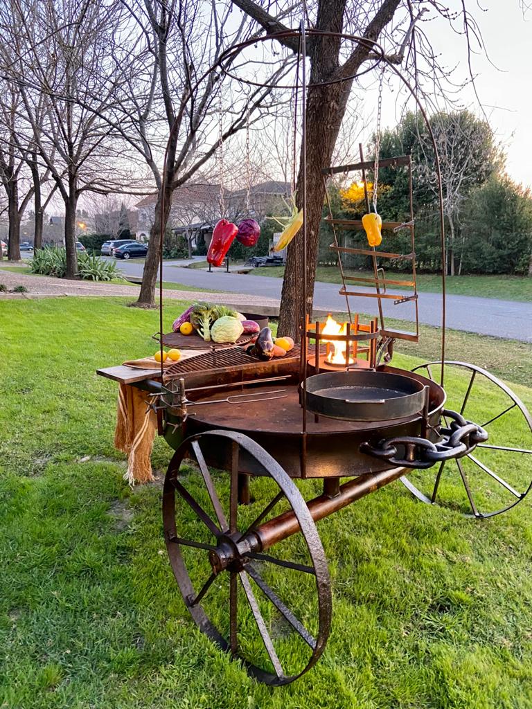 Carreta completa Medidas: 135cm diámetro #asado grande #parrilla grande y chica #brasero leñero #piche #paellera #jaula con cadenas y ganchos #quemador grande de Bioetanol 8hs autonomía #10 litros Bioetanol #kit de encendido + instructivo