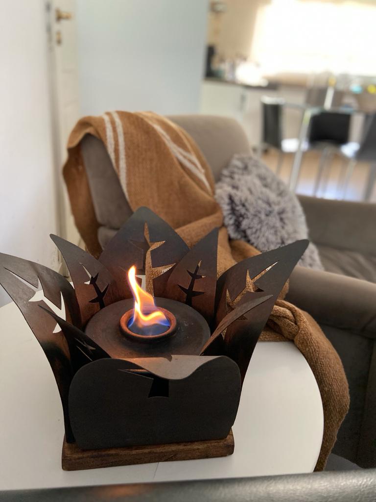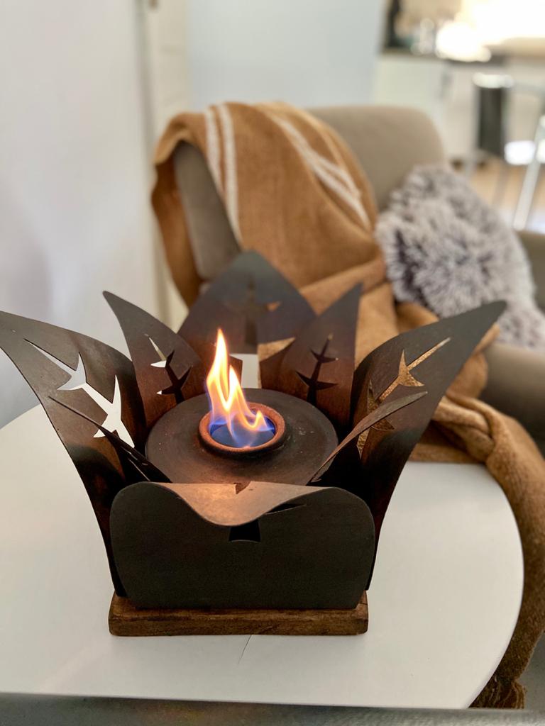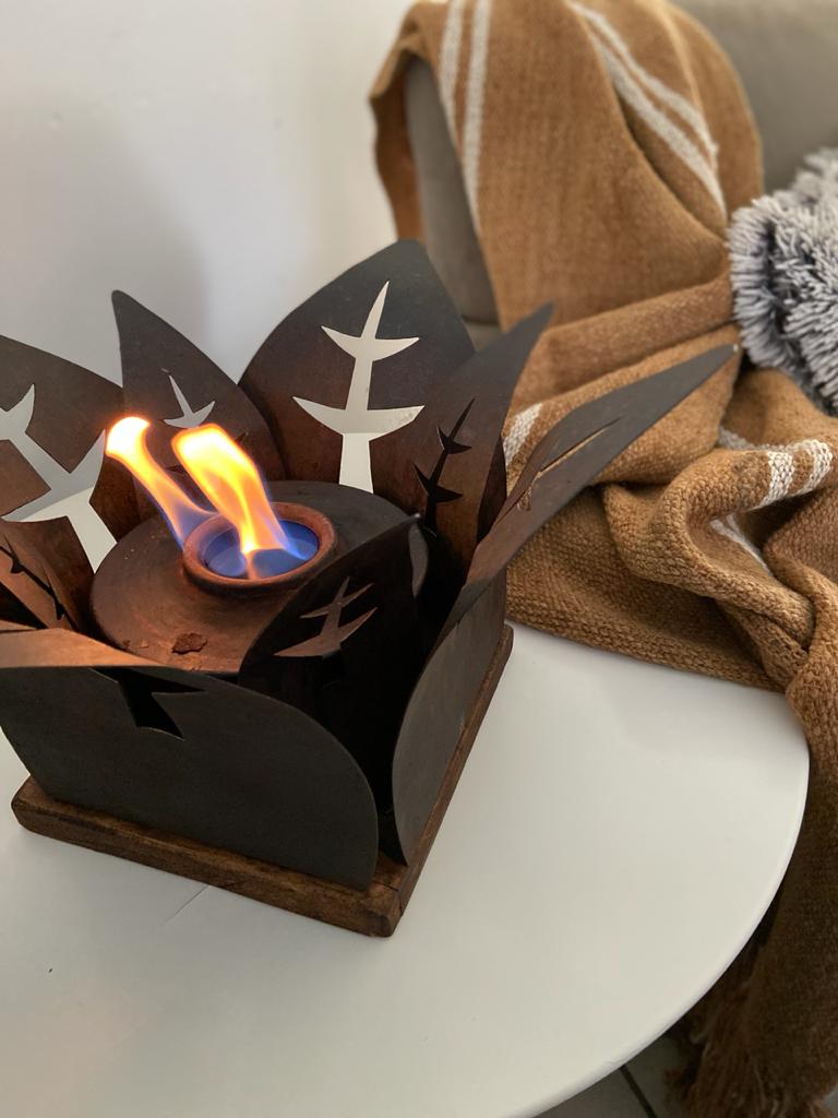 Quemador mediano de 1.4 litros Autonomia 8hs Medidas: 25x25x27cm altura Base de madera